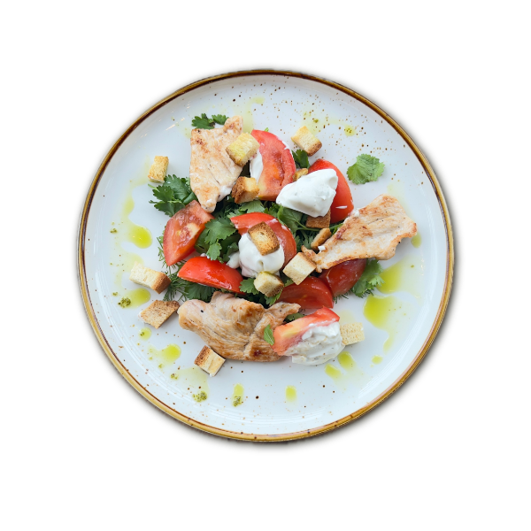 Состав: стейк индейки,масло чесночное,томаты,микс зелени,соус цезарь ,сухари