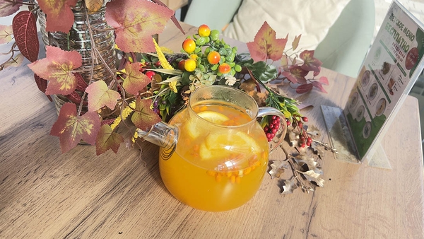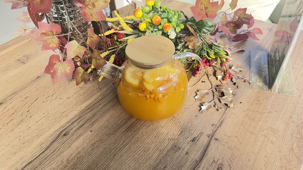 Состав: апельсин, палочки корица, облепиха, пюре облепихи, сироп ваниль, мёд