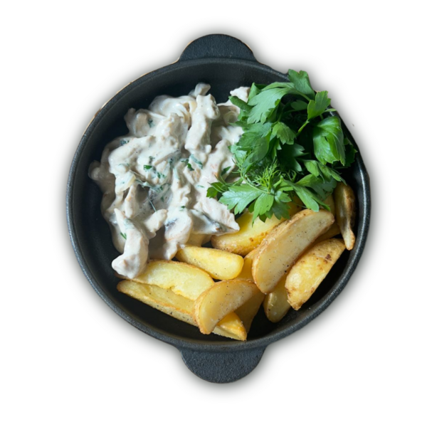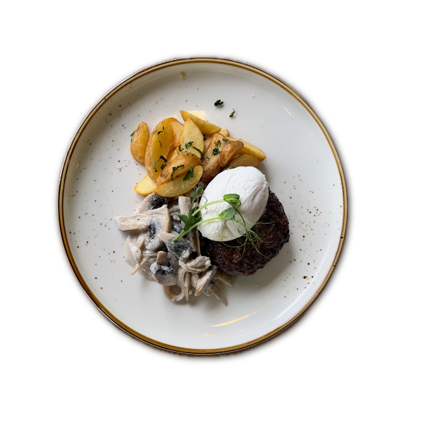 Состав: Фарш говяжий, яйцо куриное, шампиньоны, лук репчатый, сливки, бульон куриный, картофель по-деревенски, микро зелень.