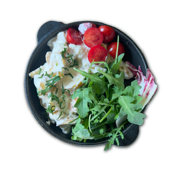 Состав :Филе пангасиуса, лосось слабосоленая, томаты Черри, лук репчатый, чеснок, соль, перец чёрный, микс салата, картофель по-деревенски, зелень, сливки, куриный бульон.