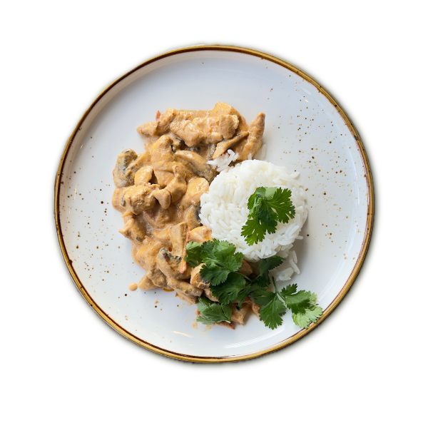 Состав: куриное филе, лук, шампиньоны, сливки, куриный бульон, рис отварной, томаты, кинза.