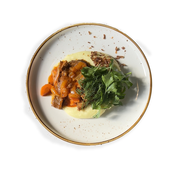 Состав :мясо говядины,перец болгарский,морковь,лук репчатый,специи,картофельное пюре,микс зелени.