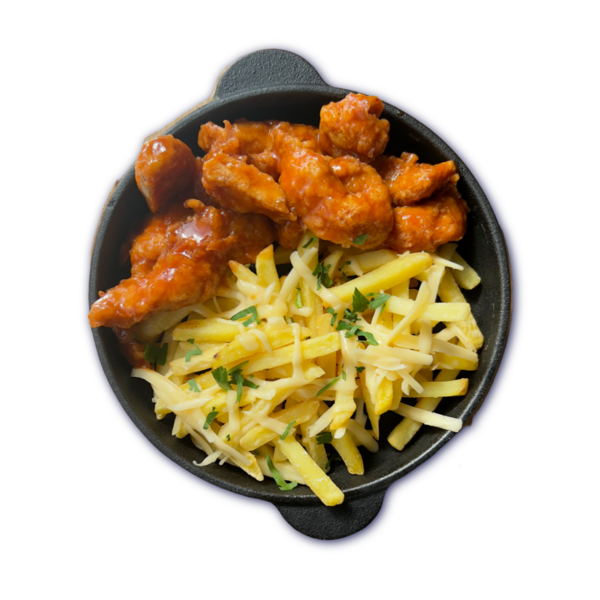 Состав: картофель фри, куриные стрипсы, соус барбекю,зелень,сыр голландский